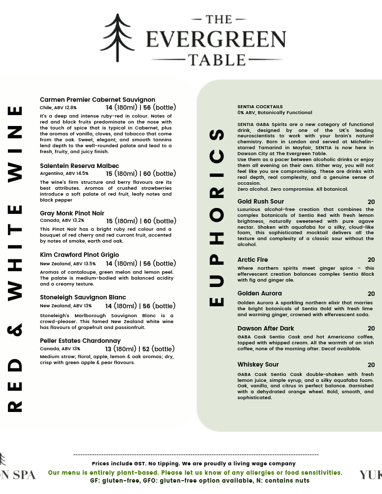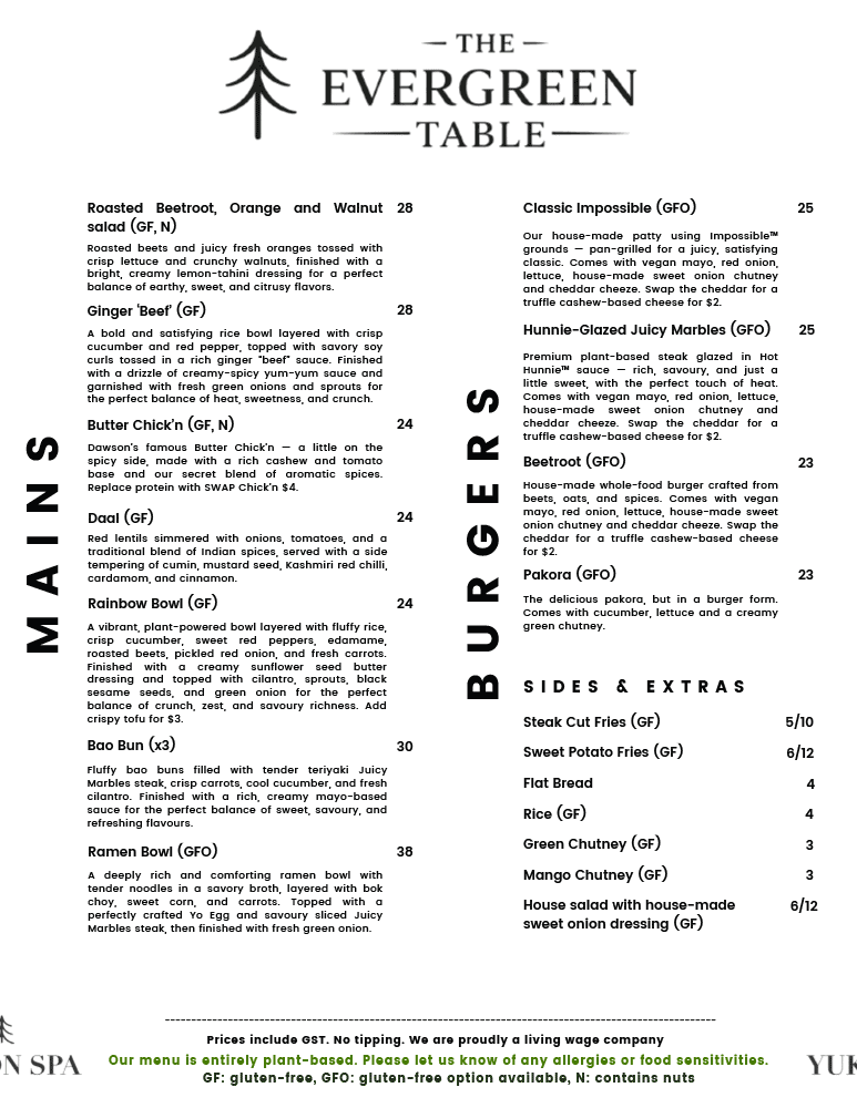 The Evergreen Table Restaurant is open Thursday to Monday evenings, 5:00 pm – 9:00 pm, offering a more refined dining experience while keeping the same welcoming atmosphere you know and love.